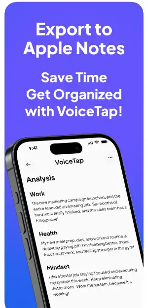 Record voice notes, tag them with custom keywords (like Work, Family, Mindset), and let VoiceTap transcribe and sort them automatically. You can export everything cleanly into Apple Notes.